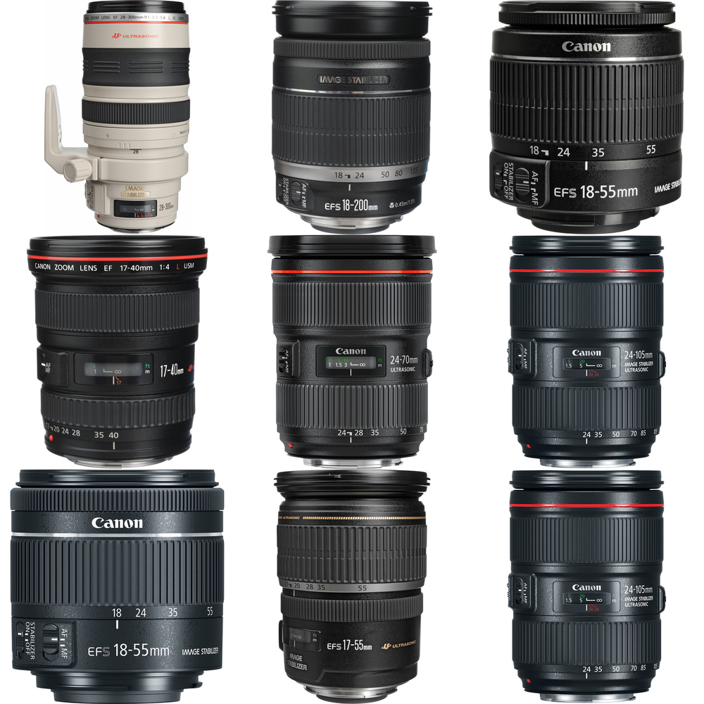 EF 17-40mm f/4L USM, EF 24-105mm f/4L IS II USM, EF 24-70mm f/2.8L II USM, EF 28-300mm f/3.5-5.6L IS USM, EF-S 17-55mm f/2.8 IS USM, EF-S 18-135mm IS USM, EF-S 18-200mm f/3.5-5.6 IS, EF-S 18-55mm f/3.5-5.6 IS II, EF-S 18-55mm f/4-5.6 IS STM