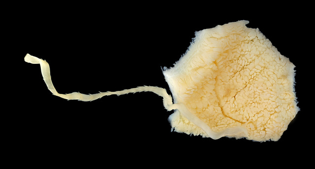 In these photographs you can see tapeworms attached to the intestine of a shark. These photographs have helped us understand that the serrated margins of these worms help secure the worm to its host by locking into small surface features of the intestine like dovetail joints — something never before shown — demonstrating the functionality of these previously mysterious structures.